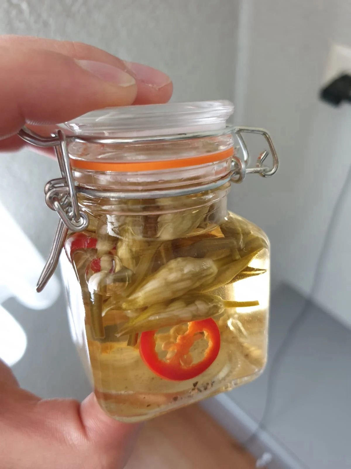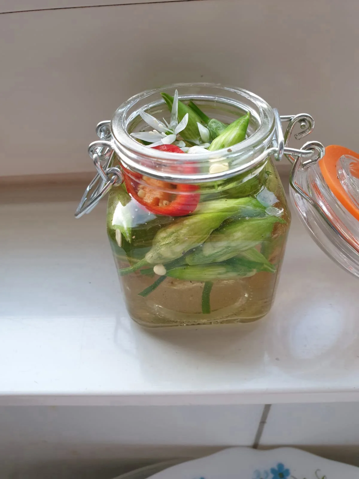 De bereiding is simpeler dan simpel. Alles in de weckpot beetje roeren en klaar. Als je het op deze manier doet is het echter beperkt houdbaar, wel krijg je de smaak van de pickle. Wil je hem langer bewaren dan zul je eerst het azijn samen met het water en het zout moeten verhitten. Doe de daslook, peperkorrels en de chili peper in de weckpot. Giet hier je warme mengsel op en doe de pot dicht zodat deze vacuüm trekt. Tip: Om te wecken kies je voor goede weckpotten, gebruik geen potje van een paar cent, die sluiten niet luchtdicht af of knappen door het vacuüm.